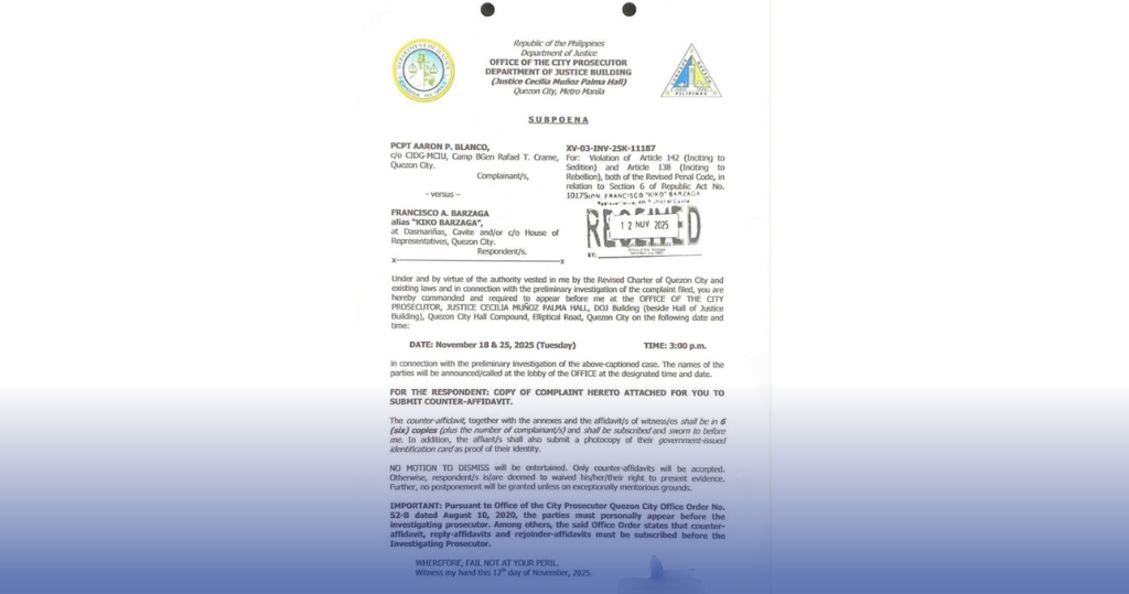 Kasama rin sa kumalat sa social media ang kopya ng subpoena kay Barzaga, na nagmula sa Office of the Prosecutor ng Quezon City.