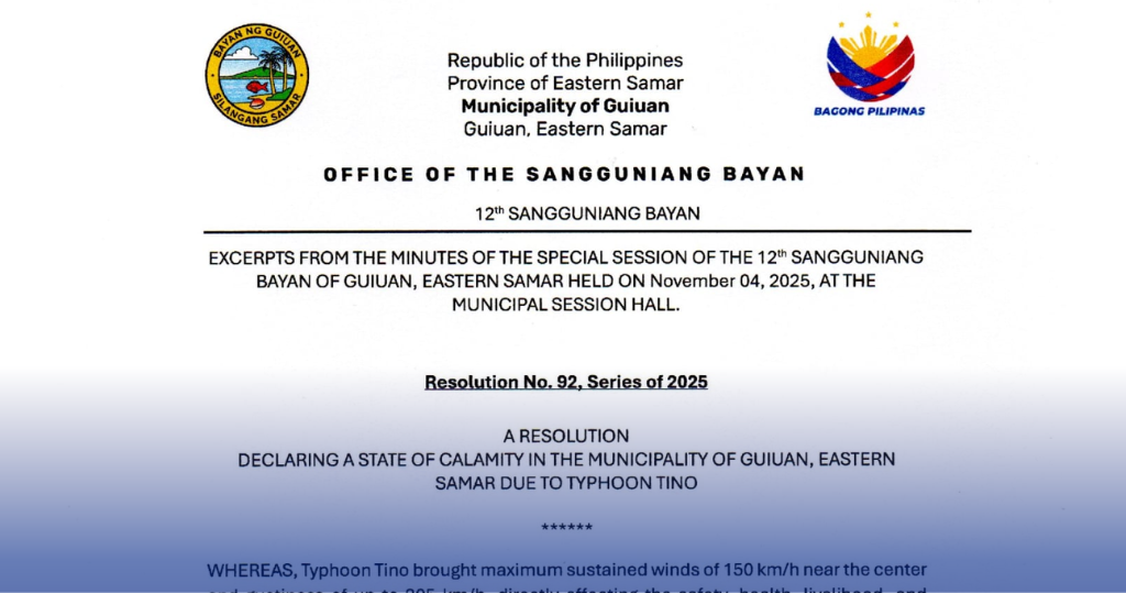 Inaprubahan ng Sangguniang Bayan ng Guiuan sa kanilang special session kahapon ang deklarasyon, kasunod ng ulat ng Municipal Disaster Risk Reduction and Management Council hinggil sa “extensive destruction” at “massive evacuations” bunsod ng pananalasa ng bagyo.