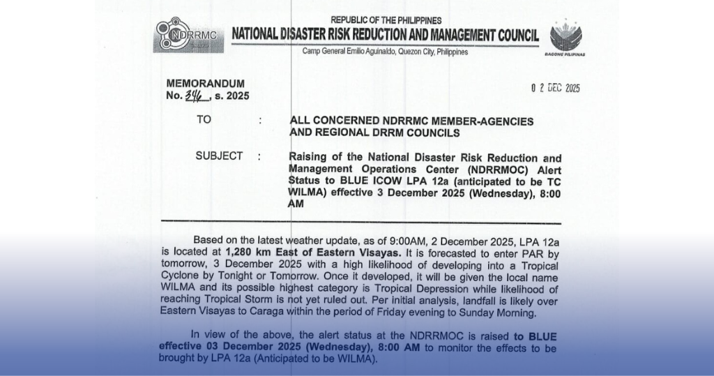 Ayon sa inilabas na memo, epektibo ang pagtataas ng alert status simula noong December 3, 2025. Inaatasan ang lahat ng kaukulang ahensya, kabilang ang PNP, AFP, BFP, PCG, at technical staff ng DOST-PAGASA, na mag-report sa MDRRMOC at panatilihin ang Virtual Emergency Operation Center para sa tuloy-tuloy na koordinasyon.