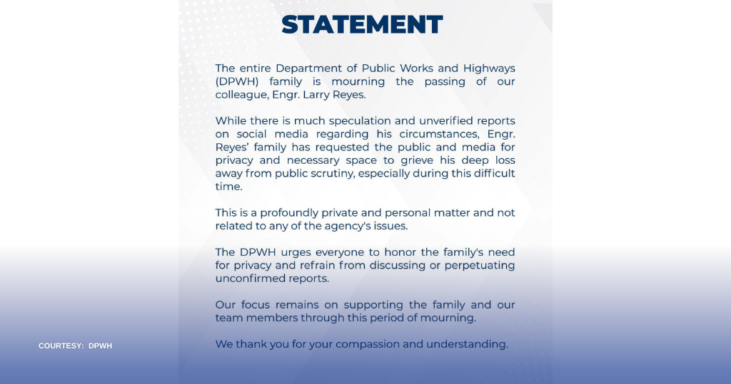 Nagpahayag ng pagdadalamhati ang Department of Public Works and Highways (DPWH) sa pagpanaw ng kanilang kawani na si Engr. Larry Reyes, na nagsilbing Chairman ng Bids and Awards Committee (BAC) ng DPWH – Sorsogon 1st District Engineering Office. Sa gitna ng mga kumakalat na espekulasyon at hindi beripikadong ulat sa social media, humiling ang pamilya