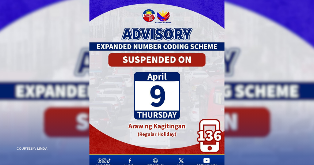 Sinususpinde ng Metropolitan Manila Development Authority ang implementasyon ng expanded number coding scheme bukas, April 9.