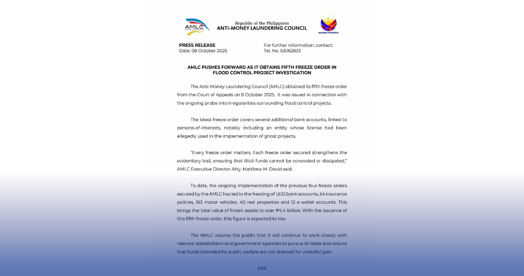 Ito’y matapos makakuha ang AMLC ng ika-limang freeze order mula sa Court of Appeals ngayong Miyerkules.