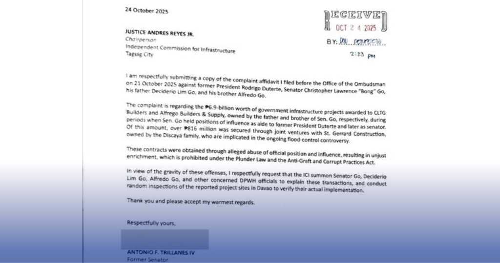 Kinumpirma ng Independent Commission for Infrastructure (ICI) na natanggap na nito ang liham at kopya ng reklamo ni dating senador Antonio Trillanes IV kaugnay ng umano’y ghost at anomalous infrastructure projects.