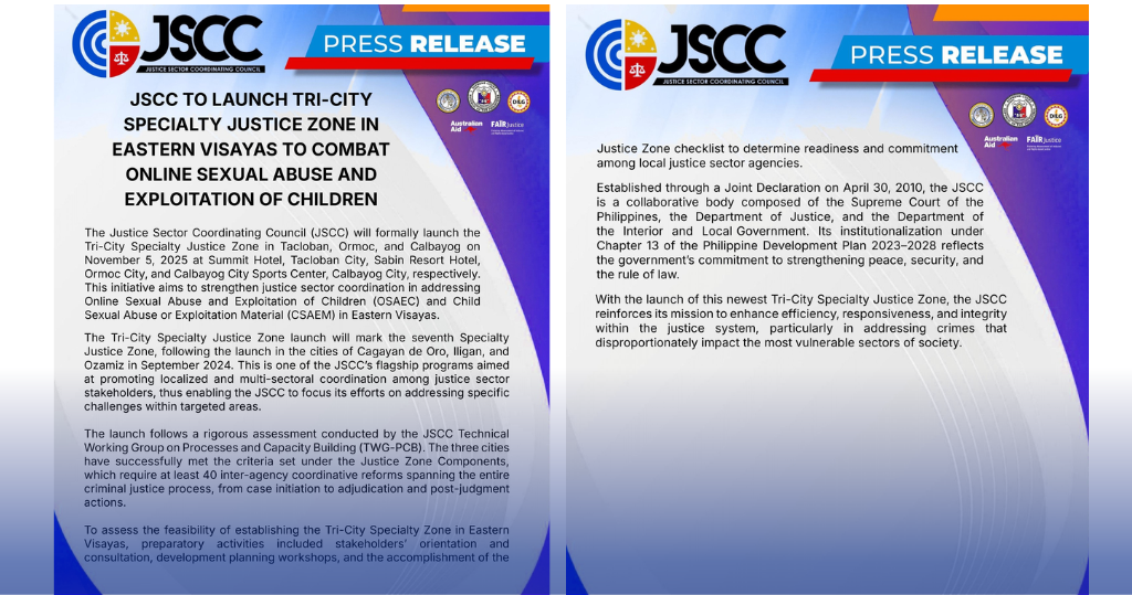 Ilulunsad ng Justice Sector Coordinating Council (JSCC) ang Tri-City Specialty Justice Zone sa Eastern Visayas bilang tugon sa lumalalang kaso ng online sexual abuse at exploitation ng mga bata.