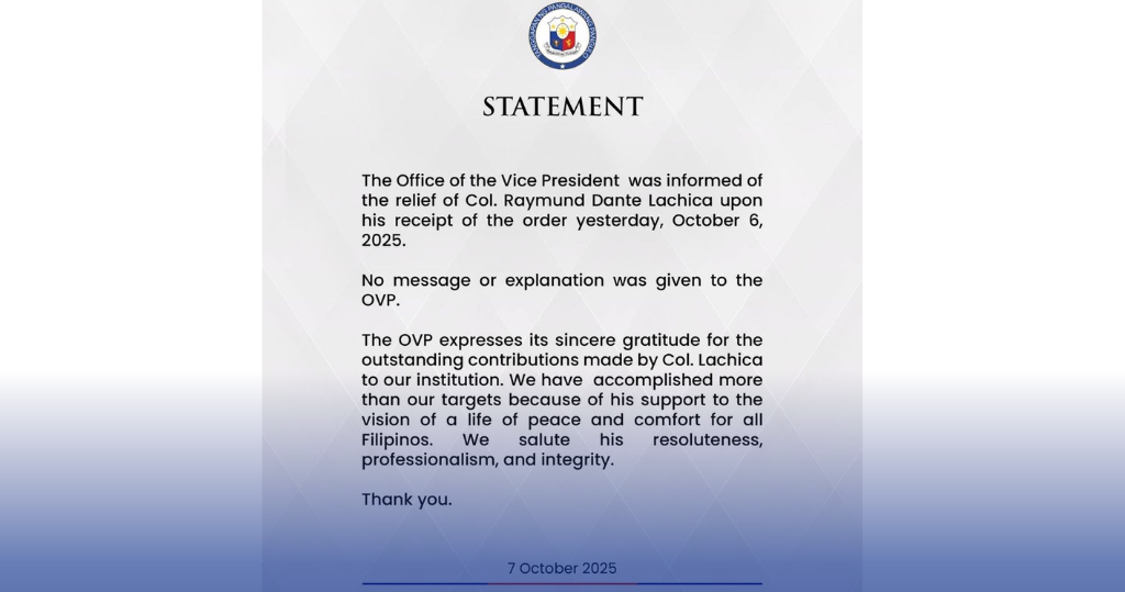 Sa isang pahayag, sinabi ng OVP na nalaman lamang nila na ni-relieve si Lachica sa puwesto matapos matanggap ang kautusan noong Lunes.
