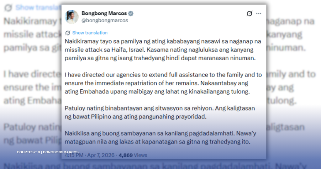 Nagpaabot ng pakikiramay si Pangulong Ferdinand Marcos Jr. sa pamilya ng Pilipina na nasawi sa missile attack sa Haifa, Israel.