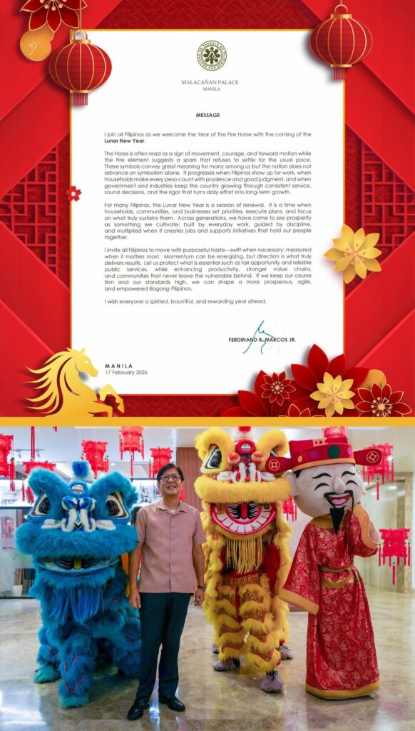 Sa kanyang mensahe sa pagsalubong sa Year of the Fire Horse, sinabi ng Pangulo na sinisimbolo ng kabayo ang pagkilos, katapangan at pagsulong habang ang apoy ay para sa energy at drive.