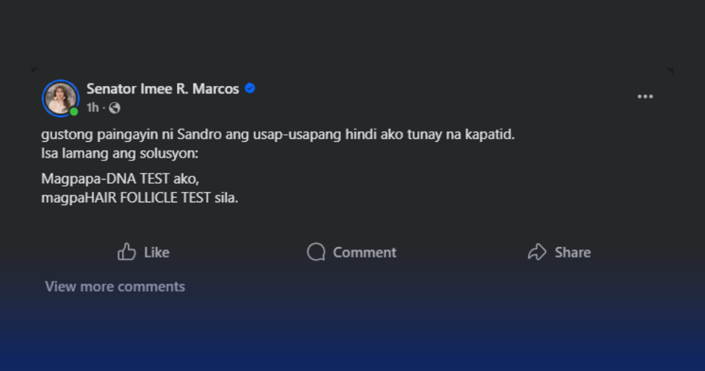 Sa kanyang Facebook post, sinabi ni Sen. Imee na gustong paingayin ni Sandro ang usap-usapang hindi siya tunay na kapatid.