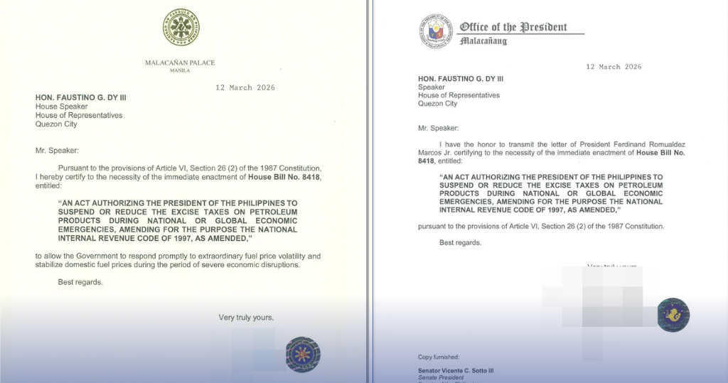 Ang dalawang sulat na may petsang March 12, 2026 ay naka-address kay House Speaker Faustino Bojie Dy III.
