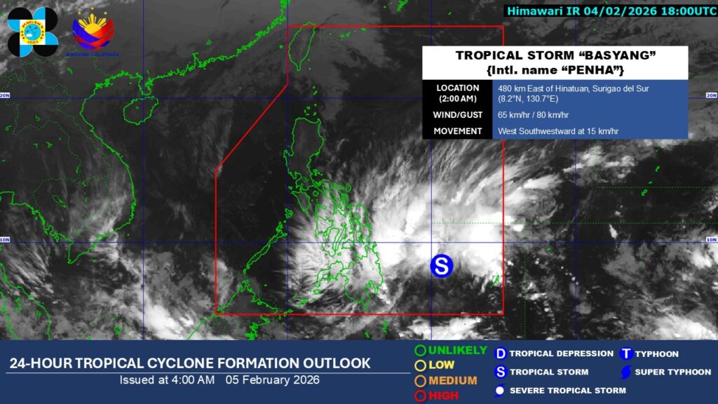 Napanatili ng Tropical Storm Basyang ang lakas nito habang kumikilos patungong Eastern Mindanao.