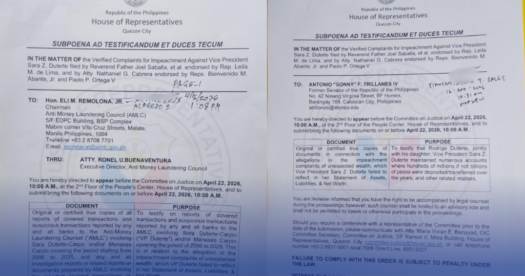 Kinumpirma ng secretariat ng House Committee on Justice na kapwa natanggap nina Eli Remolona Jr., chairman ng Anti-Money Laundering Council, at former senator Antonio Trillanes IV ang subpoena ad testificandum et duces tecum. Sina Remolona at Trillanes ay pinahaharap sa hearing bukas ng alas diyes ng umaga sa Kamara de Representantes. Bukod sa […]