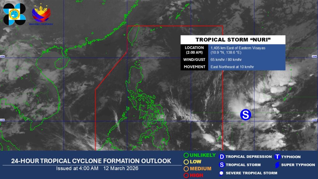 Huling namataan ng PAGASA ang Tropical Storm Nuri, kaninang 2 a.m., 1,405 kilometers silangan ng Eastern Visayas, taglay ang lakas ng hanging aabot sa 65 kilometers per hour at pagbugso na hanggang 80 kph habang kumikilos pasilangan hilagang-silangan sa bilis na 10 kph.