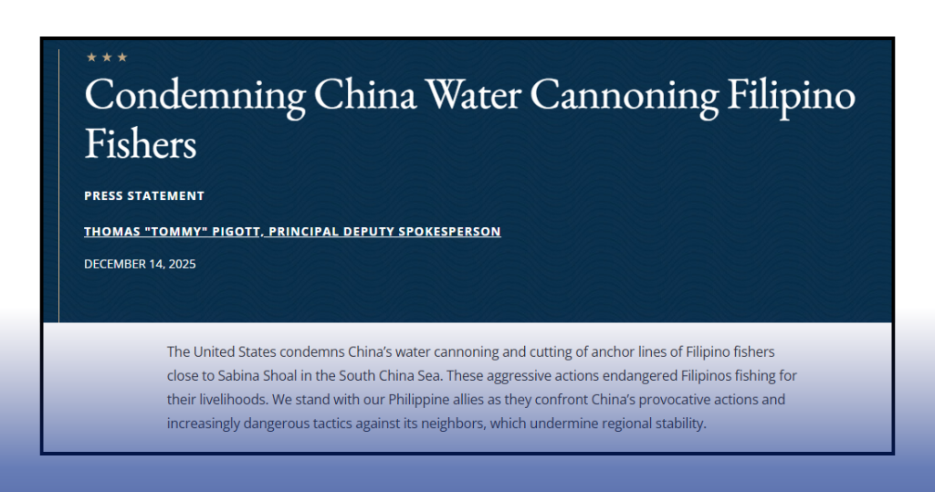 Nagpahayag ng suporta ang United States sa Pilipinas at kinondena ang umano’y agresibong aksyon ng China Coast Guard matapos masugatan ang mga Pilipinong mangingisda sa Sabina Shoal o Escoda Shoal sa West Philippine Sea.